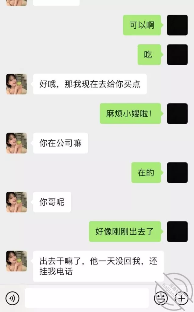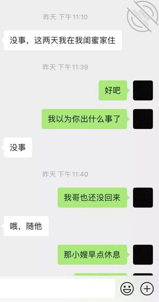然后后面我哥暴怒完后,我就给小嫂子又发了信息,七七八八的聊天内容我全截下来了,不过小嫂子发的那两张聊天记录,是我哥发给她的,基本上都是骂人的话,还有就是揭小嫂子的底,问小嫂子是不是和别人睡了,表子之类的,反正挺难听的,我就给打码了,兄弟们不要见怪,有些不方便发出来,就大致口述一下。