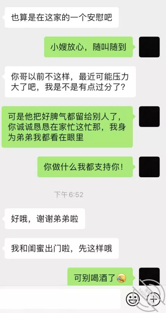 对了,写到这里,之前我打码的我哥发给我小嫂子的那个聊天记录里面, 我哥说因为我妈不同意我哥和他前女友在一起,他才相亲才和小嫂子结婚的,我不知道我哥这话是不是只是为了气小嫂子,但是可以想象,小嫂子当时应该挺难过的,记得当时他们两个结婚,我给小嫂子端洗脚水,小嫂子给我红包那会,她明明就像天下最幸福的女人,现在再想想他们这个家,想想小嫂子,真替小嫂子感到不值。