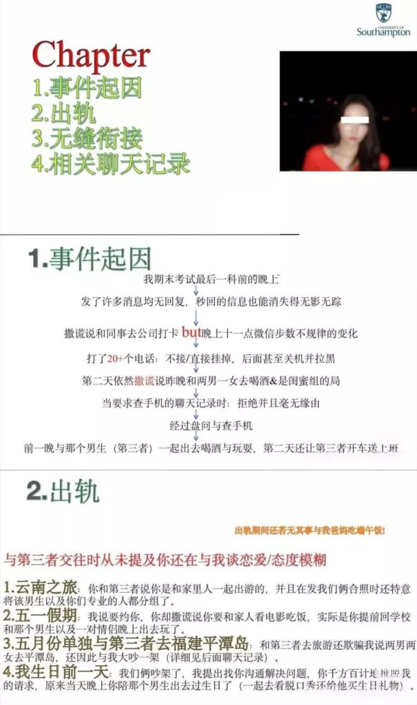 英国soton南安普顿商学院劲爆大事件,17页ppt痛斥究极海王女邓梦婷,背着男友在学校脚踏多只船,谎称自己出去,其实背地里找男闺蜜解决性需求,被实锤后妄图狡辩,谁知海王女亲妈逆天发言“没结婚就不算出轨”