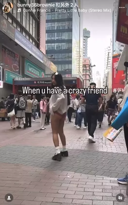 香港 网路疯传一段仅6秒的短影片,一名女子站在旺角港铁站外,突然掀起短裙、 露出 内裤。后续有眼尖的老司机发现此人应该是台湾著名网黄Bunnybrownie嘿尼。