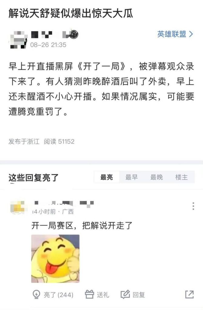 LPL英雄联盟官方解说天舒直播重大事故酒后直播双排